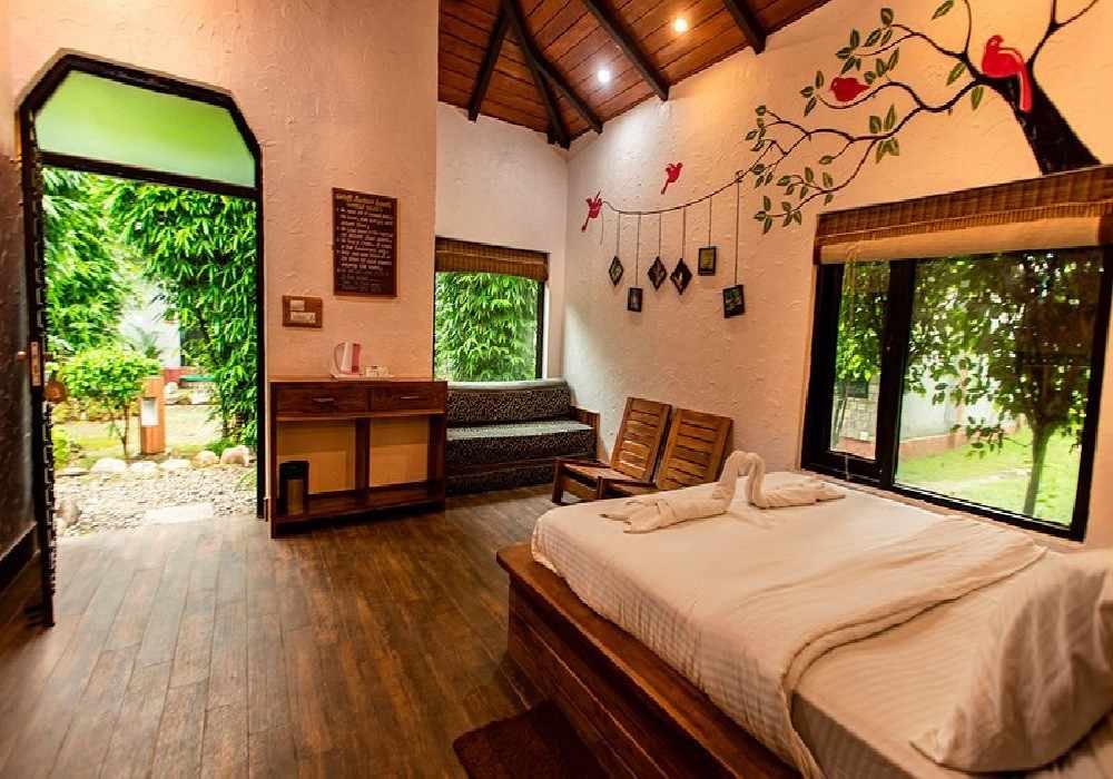 The resort offers a range of accommodations, including cozy cottages, luxury suites, and machaan-style elevated rooms that give a bird's-eye view of the forest. All rooms are equipped with modern amenities such as air conditioning, Wi-Fi, flat-screen TVs, minibars, and private balconies overlooking the natural surroundings. Travelers can enjoy waking up to the sounds of the forest and panoramic vistas of rivers, hills, and wildlife habitats.