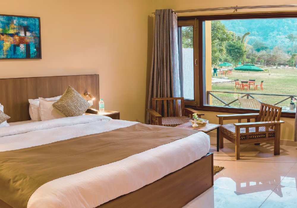 Corbett River Valley Resort features well-appointed rooms, suites, and riverside cottages designed to provide comfort and luxury. Each room comes equipped with modern amenities such as air conditioning, Wi-Fi, flat-screen TVs, tea/coffee makers, mini-bars, and private balconies with breathtaking views of the forest or river. Families can opt for spacious suites, while couples often choose romantic riverside cottages for privacy and scenic views.