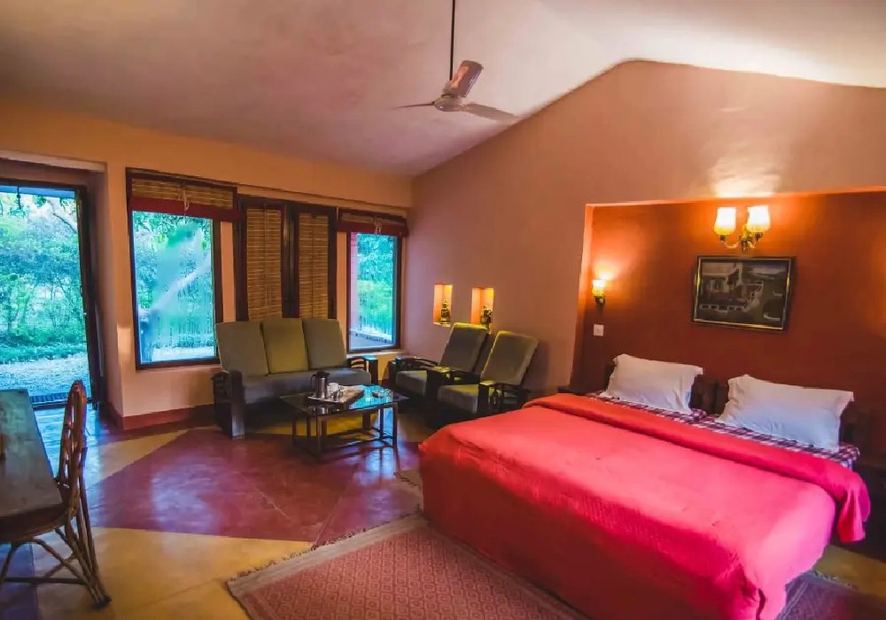 Jaagar – The Spirit of Corbett features well-appointed cottages, villas, and rooms that seamlessly combine modern comfort with the serenity of the forest. Each accommodation includes air conditioning, high-speed Wi-Fi, flat-screen TVs, minibars, and 24/7 room service. Private balconies or terraces provide panoramic views of the surrounding landscape, allowing guests to unwind and connect with nature. Thoughtful interiors and cozy furnishings ensure a comfortable and rejuvenating stay.